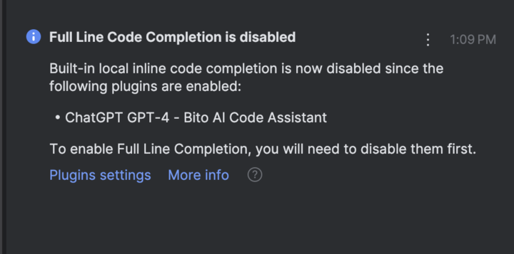 JetBrains has released a new version, 2024.1 EAP, which introduces a new feature called **"Full Line Code Completion"**. Since this release, all JetBrains plugins supporting Line/Code completion have encountered an issue where end users receive a notification to disable the plugin if they want to access built-in local inline code completion.