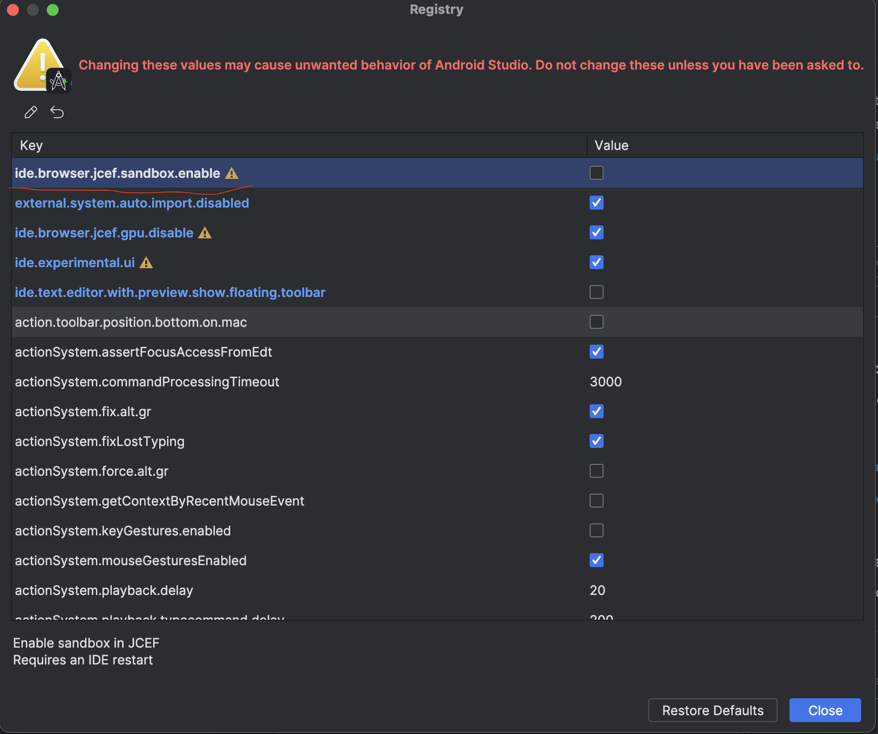 3. In the opened list, find and disable the `ide.browser.jcef.sandbox.enable` options.